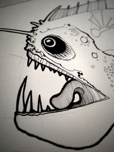 After a rough pencil sketch, the pens come out.